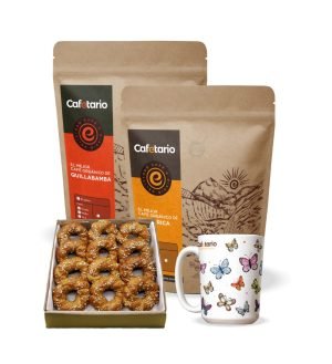 ¡Disfruta de nuestro paquete especial que incluye dos bolsas de café molido de 250 gramos cada una, 12 deliciosas rosquitas de avena y ajonjolí y una taza jumbo de 15oz!
